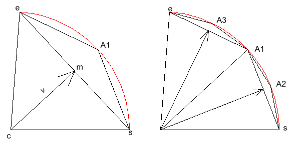 The QuestionGiven a 2D arc with arc center point c, start point s and end point e, find a series of line segments to approximate the arc. The arc's sweep angle < 180. The minimum number of required line segments is also given.